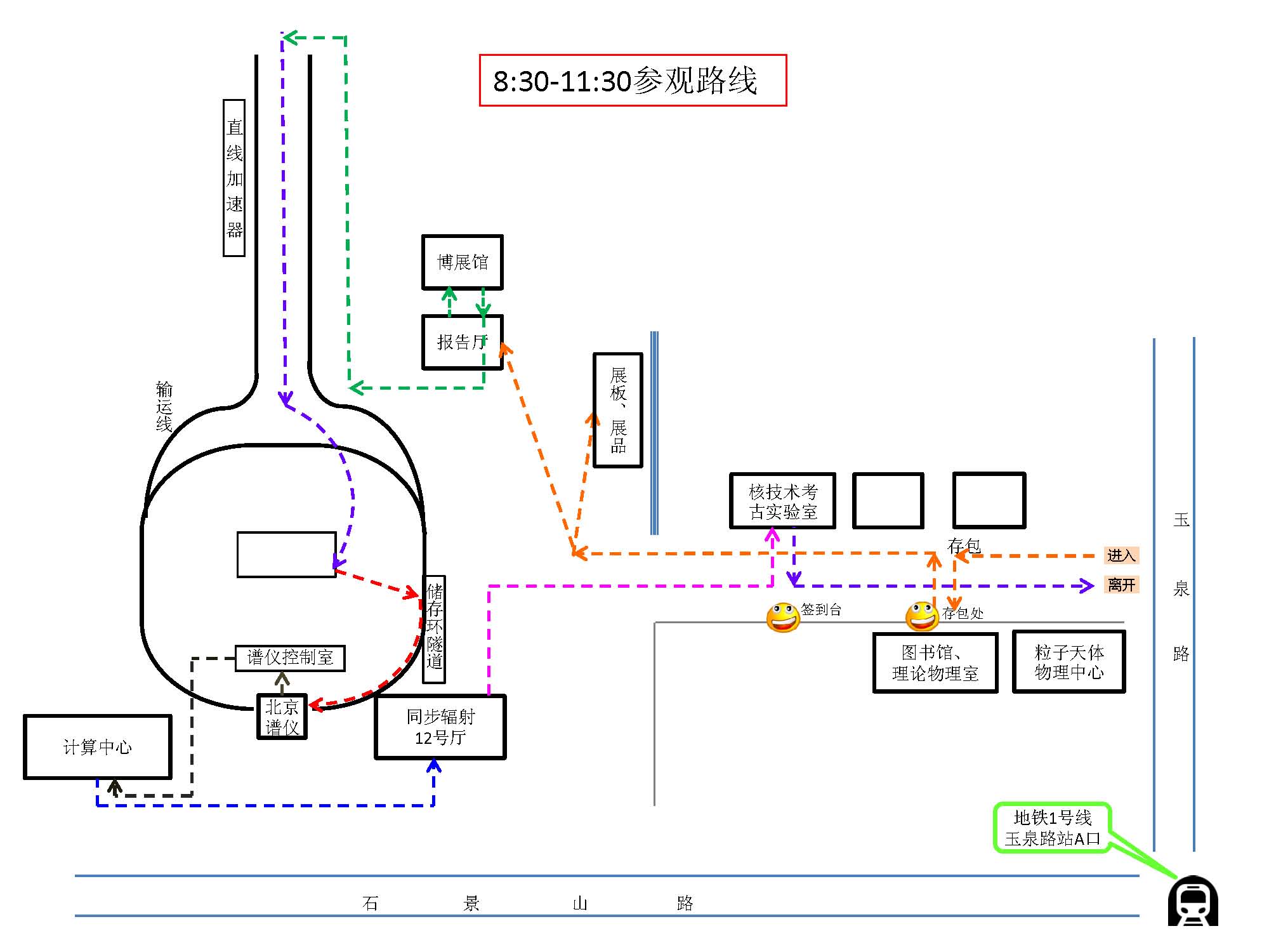 路线:直线加速器——储存环地下隧道——北京谱仪——计算中心——北京同步辐射装置——核分析实验室——网络攻防交互式演示棚——主题展板