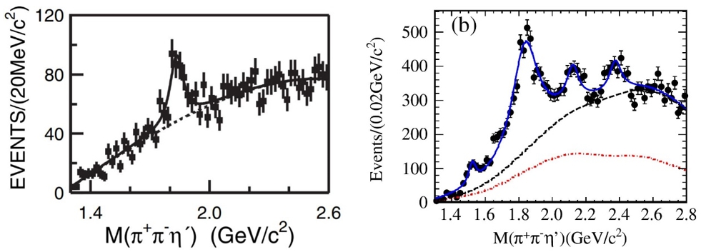 BESII发现的X(1835)信号(左)和BESIII对X(1835)的验证以及新发现的X(2120)和X(2370)