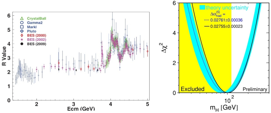 BESII测量的R值(左)以及对希格斯粒子质量预期的改进(右)