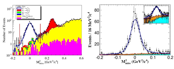 BESIII测量的D介子(左)和Ds介子(右)纯轻子衰变信号