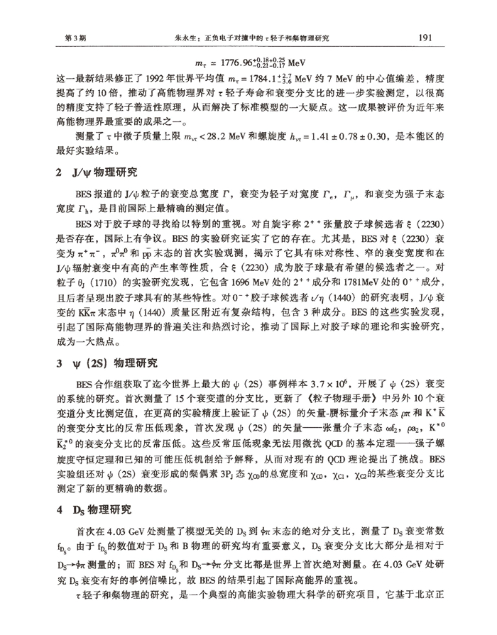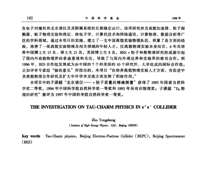 发表在《中国科学基金》1998年第3期的“正负电子对撞中的τ轻子和粲物理研究”一文(见附录)简要报道了到1996年6月为止北京谱仪获得的首批物理成果。其中不少成果处于当时的国际领先水平,被国际权威的物理期刊和粒子数据表刊登,引起了国际高能物理界的重视与好评;特别是以高精度测量了τ轻子的质量值(精度为当时已有测量值的10倍),修正了1992年世界平均值约7MeV的中心值偏差,推动了国际高能物理界对τ轻子寿命和衰变分支比的进一步实验测量,以很高的精度支持了轻子普适性原理,解决了粒子物理标准模型当时存在的一大疑点,这一成果被评价为当时高能物理界最重要的成果之一。 北京谱仪取得的首批物理成果表明,尽管我国高能物理实验研究刚刚起步,但已经显示出很高的起点,在北京正负电子对撞机和北京谱仪仅仅运行几年之后,就迅速缩短了与先进国家在这一领域中的差距,站立在了高能物理研究的前沿,在国际高能物理学界占有了一席之地。在此之后,经过重大的改进,北京正负电子对撞机亮度和北京谱仪性能不断提高,北京谱仪国际合作组由最初的中美两国10所大学和研究机构的140余位署名作者(BESCollaboration)发展到现在由11个国家52所大学和研究机构约350位署名作者组成的庞大团队(BESⅢCollaboration),北京谱仪实验研究不断取得令国际高能物理学界瞩目的物理结果,其中“2—5GeVR值的精确测量”、“新共振态X(1835)、X(2120)、X(2370)的实验观测”、粲偶素ψ(2S)衰变中的大量世界首次测量和新发现,都是当时国际高能物理学界的重大事件。北京正负电子对撞机和北京谱仪成为著名的世界级高能物理研究中心之一,我国的高能物理研究队伍也迅速地成长为国际高能物理研究的一支重要力量。 北京谱仪的实验研究成就建立在北京正负电子对撞机和北京谱仪长期、稳定运行的基础之上。这一大型科学实验基地的建造和运行,没有我国基于“解放思想、改革开放”的方针取得的综合国力的极大提升,是无法想象的。北京正负电子对撞机工程的建成得到党和国家历届领导人的直接关怀和支持,得到全国各个部门的大力协同。邓小平同志关于“科学技术是第一生产力”的论断和“中国必须在世界高科技领域占有一席之地”的重要讲话更是将发展高科技(包括重大的基础研究)领域的重要性提升到了战略的高度。实践证明了这一指示的重大意义。以北京正负电子对撞机和北京谱仪为例,这一高科技工程和重大基础研究项目的实施不但使我国的粒子物理实验研究和加速器技术迅速步入世界先进水平,同时极大地带动和促进了我国在核探测器、核电子学、计算机和互联网、大数据和云计算、半导体和大规模集成电路、核医学、超导和低温、同步辐射应用诸多领域的迅猛发展。北京谱仪实验研究成就的取得,是我国几代科技工作者长期努力的结果,从1972年张文裕等18位同志写信给周总理建议建立我国自己的粒子物理实验基地、1973年成立高能物理研究所起,到目前对撞机和谱仪上运行的值班人员,为对撞机和谱仪工作的老中青科技工作者都为之付出了辛勤的劳动。这些成就表明,中华民族有志气、有能力在人类探索自然规律并用于创造美好世界的进程中做出重要贡献。还必须提到的是国际合作的重要作用,在这方面,就职于国外的华人科学家扮演了特别重要的角色,诺贝尔奖得主李政道教授、丁肇中教授的贡献尤其突出。作为高能物理实验研究的一支新的队伍,我们曾经并且一直从欧美、日本等国的专家那里学习到许多知识和技能,从他们的研究机构和大学得到许多技术、设备甚至经费的支持。随着研究水平的提高和国家经济的发展,我国科学家对于粒子物理的规律和知识、对国际高能物理重大项目的研究队伍和经费支持都做出了有显示度的重要贡献。这一事实从一个侧面证明,习近平同志提出的“高举和平、发展、合作、共赢的旗帜”,“各国人民同心协力,构建人类命运共同体”理念的远见卓识和英明正确,在各国的国际合作(包括经济、政治、科技、文化)中贯彻这一理念具有重大的现实意义和深远的历史意义。 值此“北京正负电子对撞机(BEPC)建成30周年”之际,写此短文,以志纪念,并祝愿北京谱仪继续获得新的物理成就。