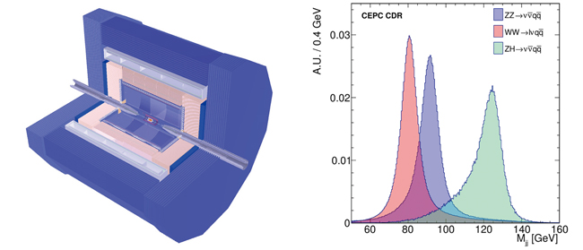 图2 CEPC 概念探测器几何,及其关键性的喷注重建性能演示:W 玻色子、Z 玻色子以及希格斯粒子在喷注末态物理事例中的分离