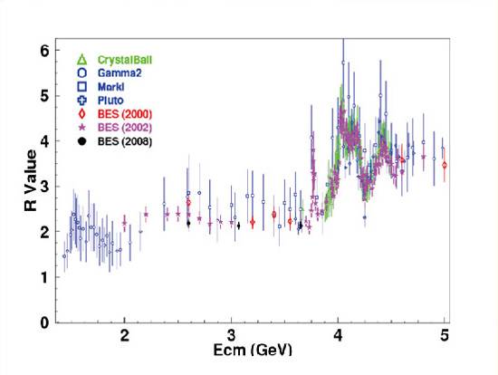 R值测量误差是导致标准模型理论计算不确定性的重要因素之一。BESII实验在2-5GeV能区测量了R值,将其精度由原来的15%左右改善到6-7%,是当时国际高能物理高精度测量前沿的重要成果之一。