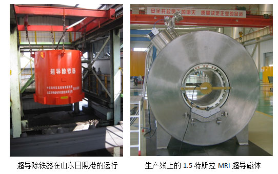 2009年,研制成功国内首台工业现场使用大型超导磁体——超导除铁器,用于除去混杂到煤炭中的铁磁性杂物。2010年,研制成功场强为1.5特斯拉的人体核磁共振成像超导磁体,作为核心关键部件,促进了国内核磁共振成像整机系统产业的提升。