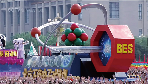 图1 群众游行队伍中的“北京正负电子对撞机”彩车(视频截图)