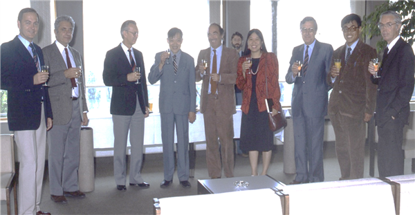 1984年,在欧洲核子中心,高能所与ALEPH组合作签字仪式上(左四为叶铭汉)