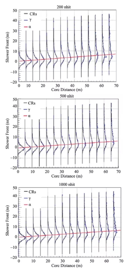 图3 火墙透视图:探测器激发数随时间(纵轴)和簇射中心的距离(横轴)的变化。蓝线对应于伽马射线,黑线对应于宇宙线。从上到下能量逐渐增加。纵轴时间乘以光速就给出不同距离处火墙的厚度【1】