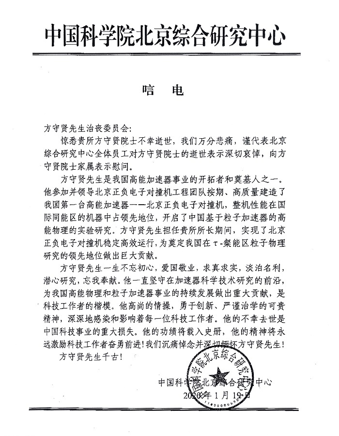 中国科学院北京综合研究中心唁电