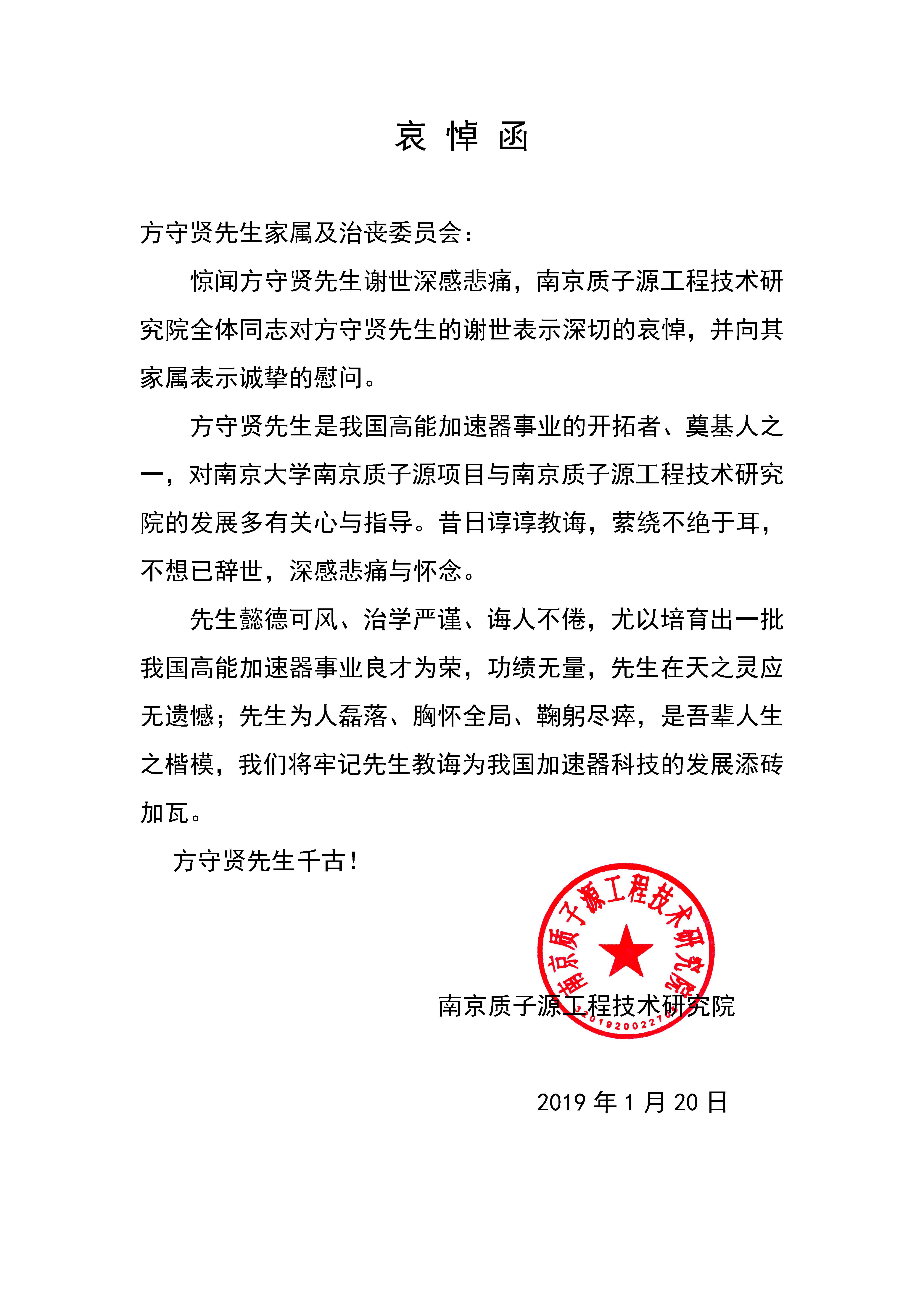 南京质子源工程技术研究院唁电