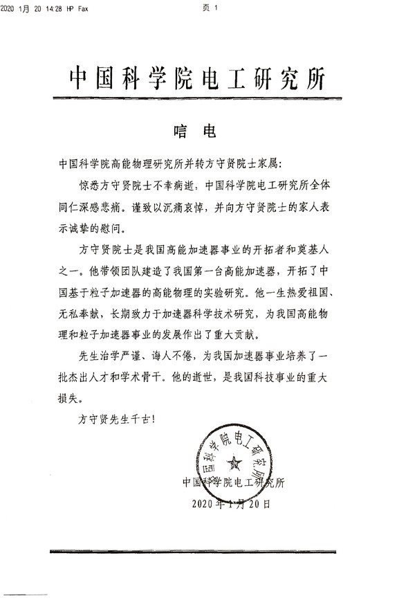 中国科学院电工研究所唁电