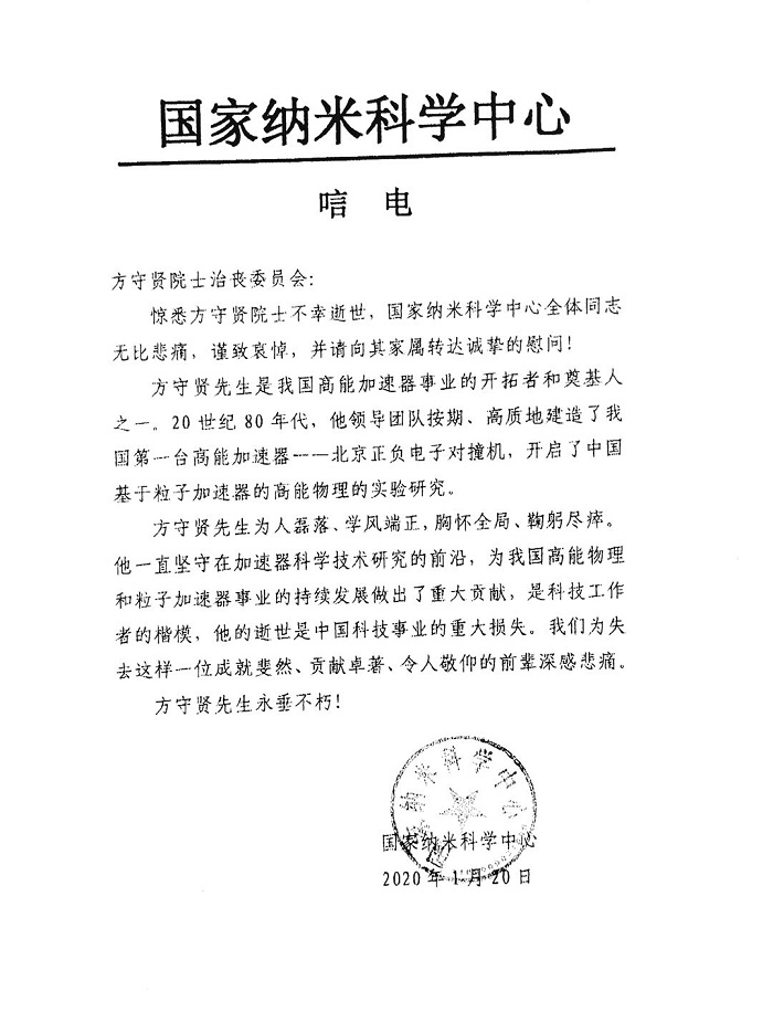 国家纳米科学中心唁电