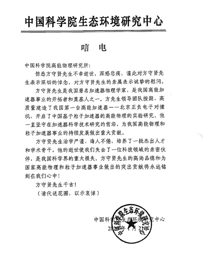 中国科学院生态环境研究中心唁电