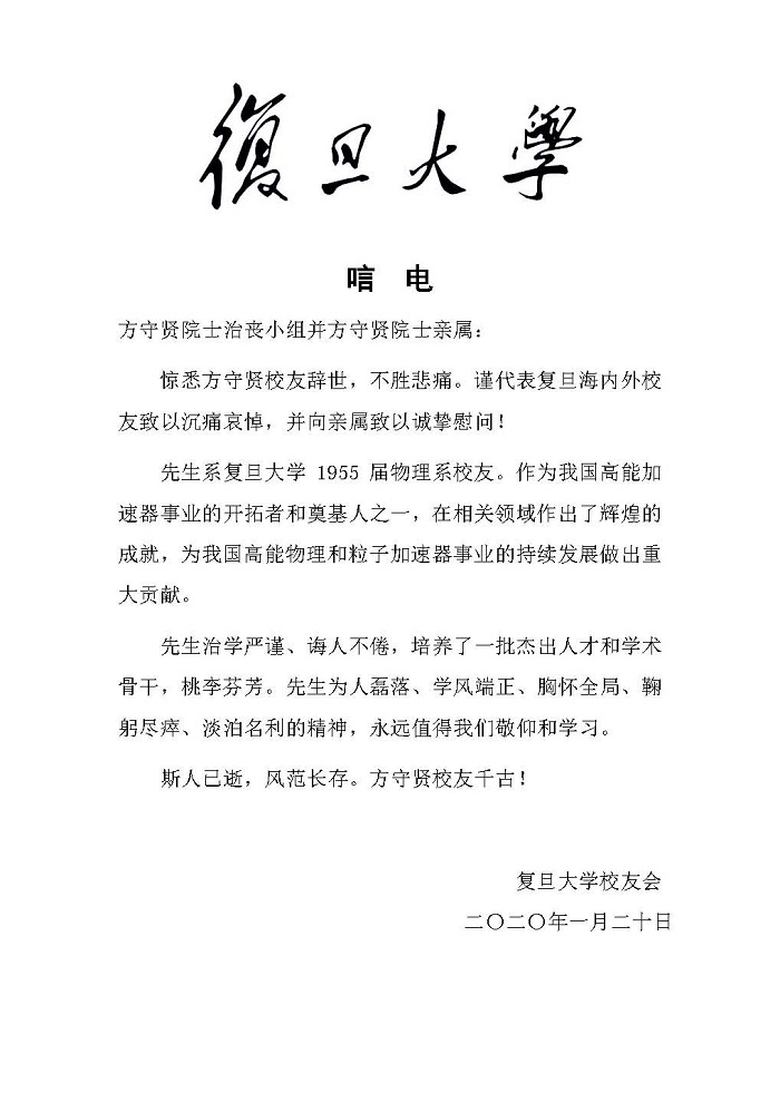 复旦大学校友会唁电