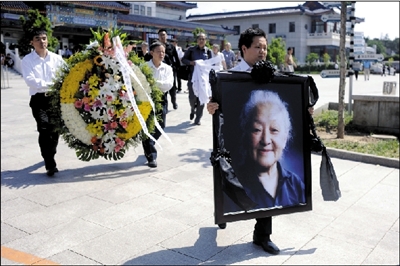 本报讯 (实习记者雷军)昨天上午,我国著名物理学家、钱三强夫人何泽慧院士遗体告别仪式在八宝山殡仪馆东礼堂举行,社会各界人士近千人到场致哀送别。