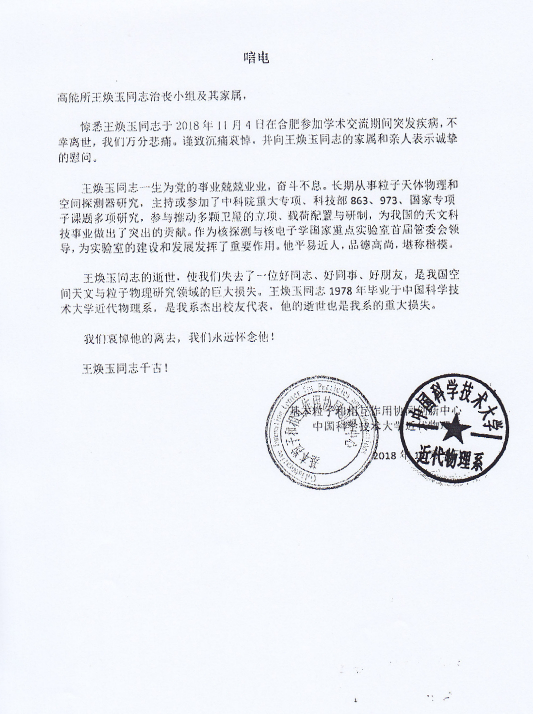 基本粒子和相互作用协同创新中心 中国科学技术大学近代物理系唁电