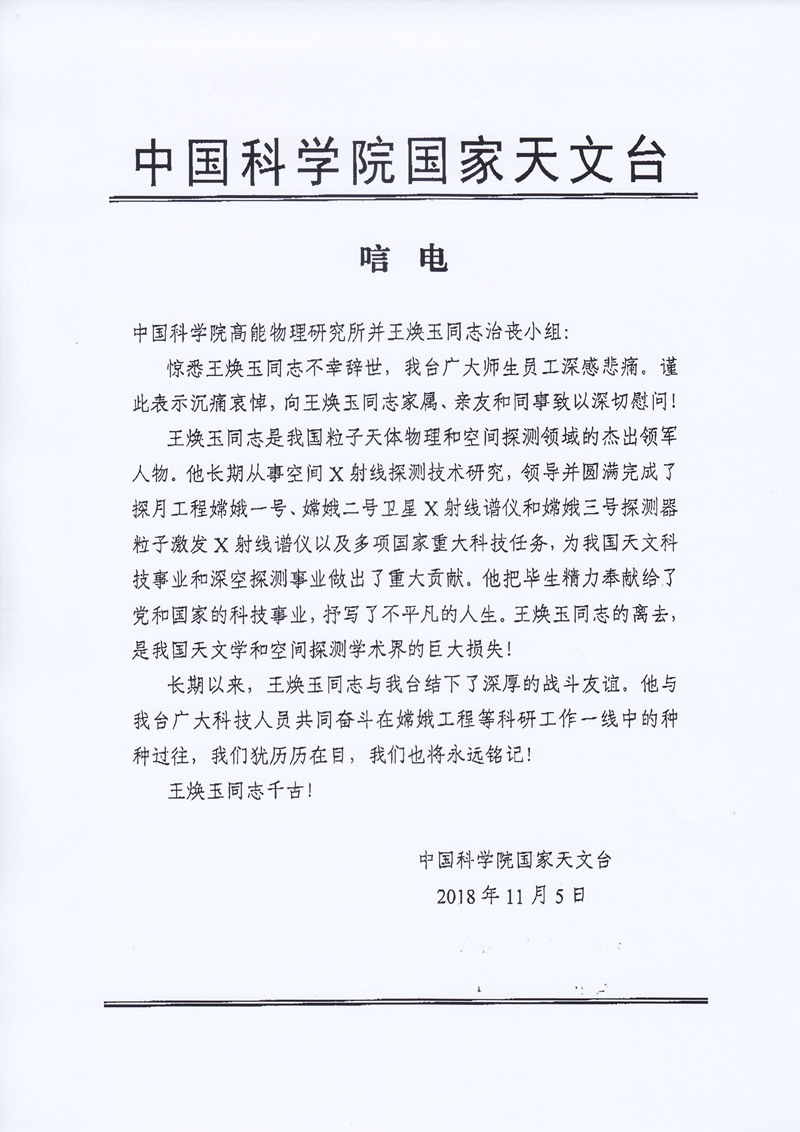 中国科学院国家天文台唁电