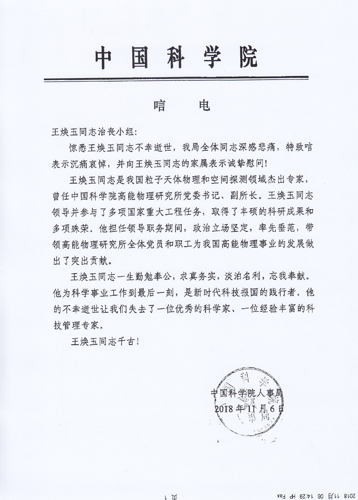 中国科学院人事局唁电