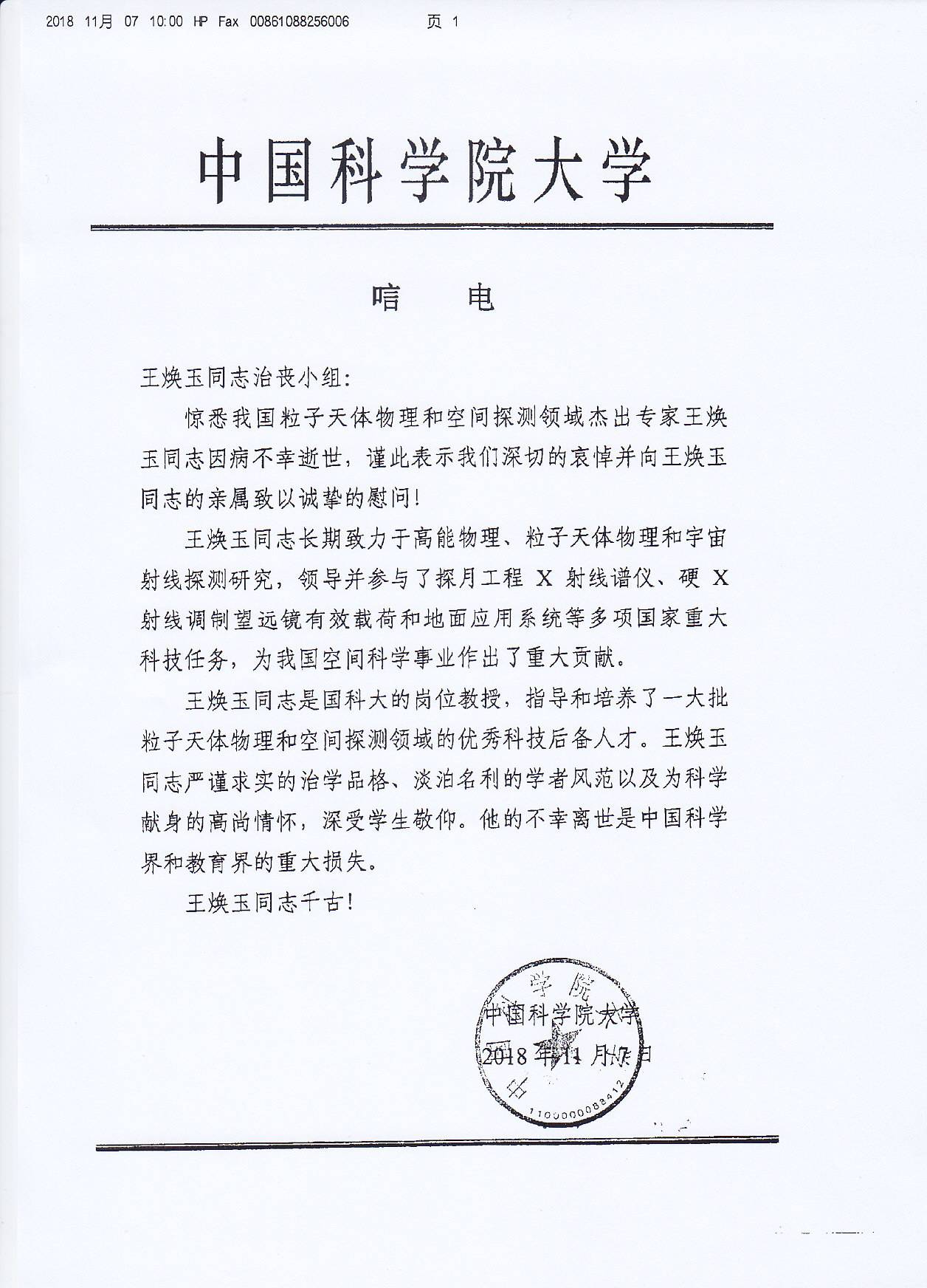 中国科学院大学唁电
