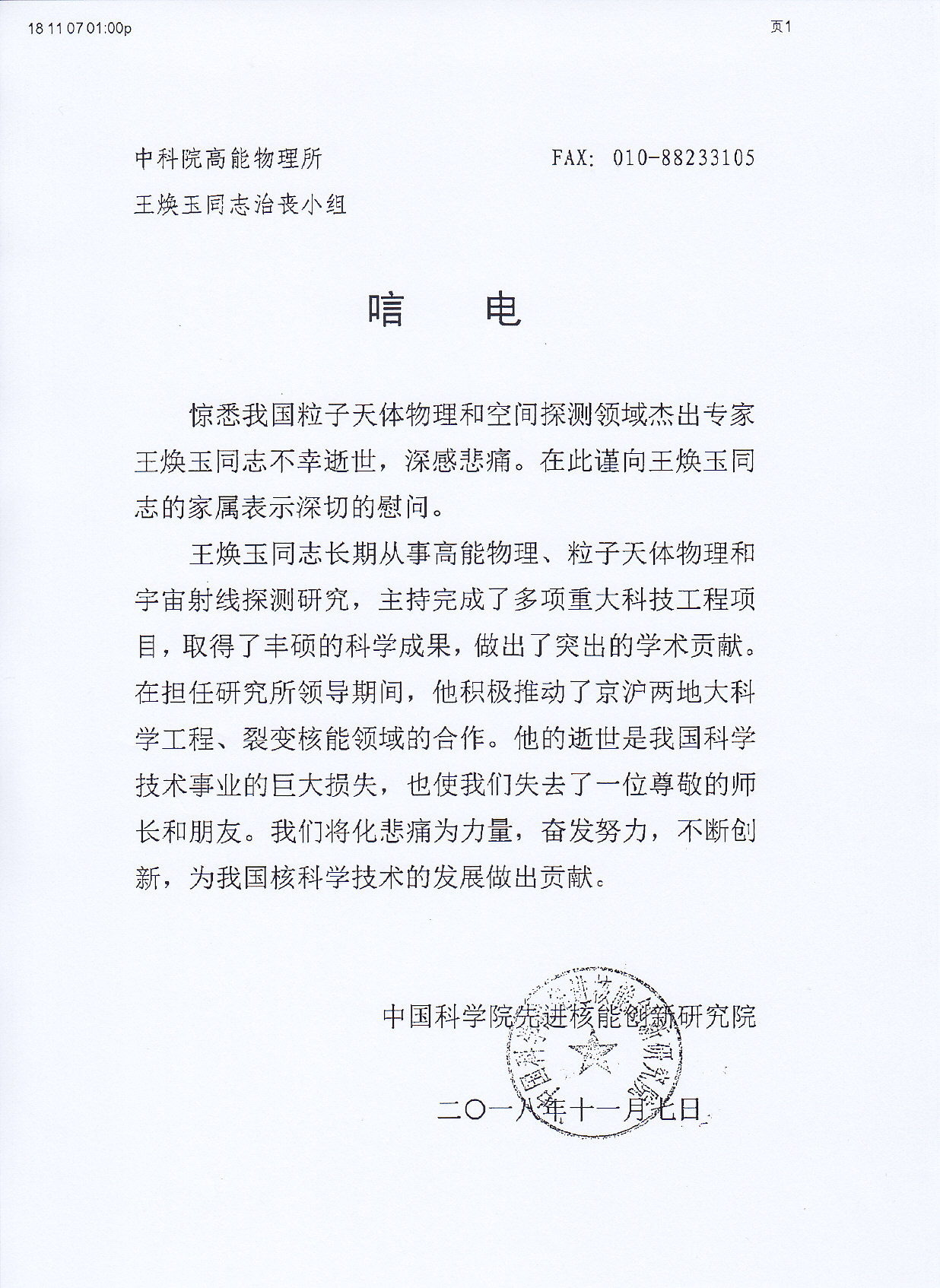 中国科学院先进核能创新研究院唁电