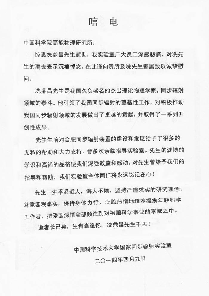 中国科技大学国家同步辐射实验室唁电