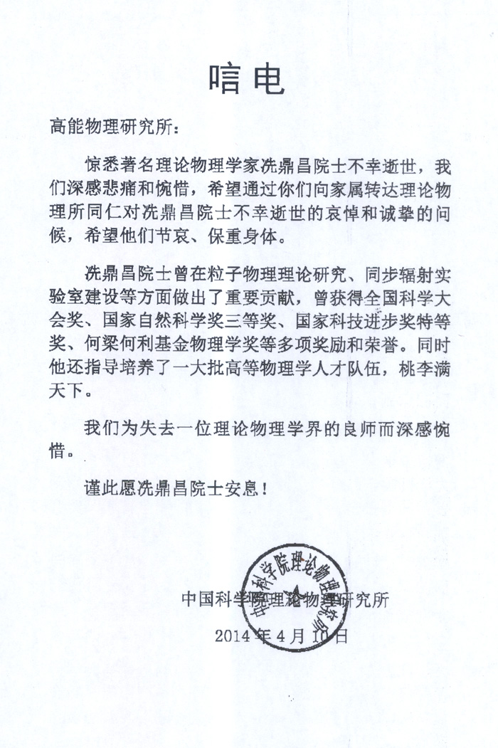 中国科学院理论物理研究所唁电