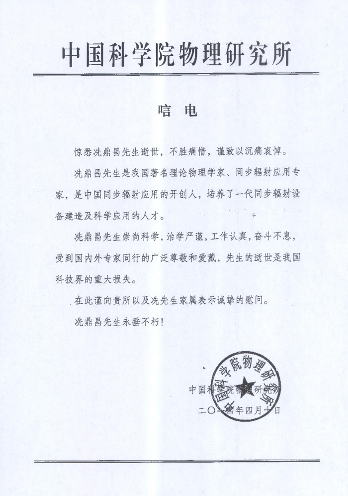 中国科学院物理研究所唁电