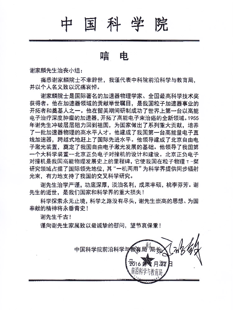 中国科学院前沿科学与教育局局长高鸿钧唁电