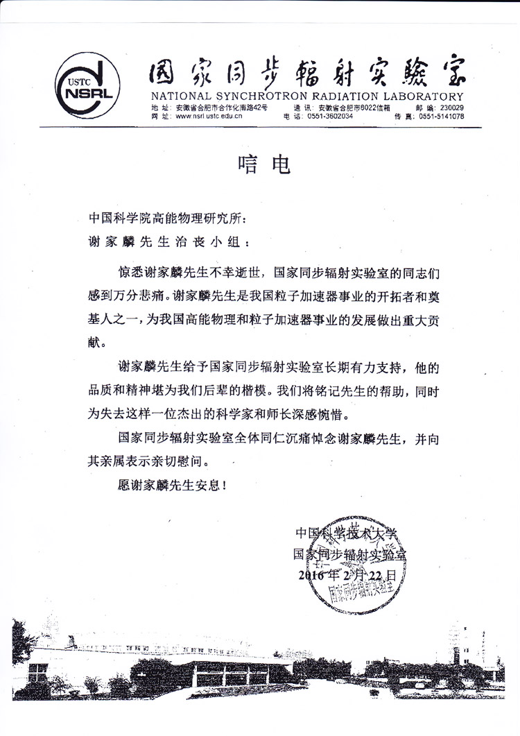 中国科学技术大学国家同步辐射实验室唁电