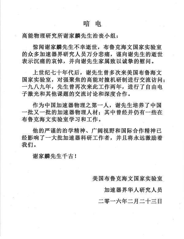 美国布鲁克海文国家实验室加速器界华人研究人员唁电
