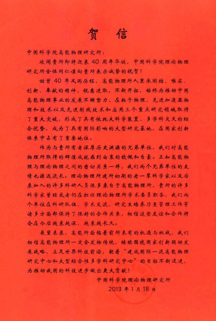中国科学院理论物理研究所贺信