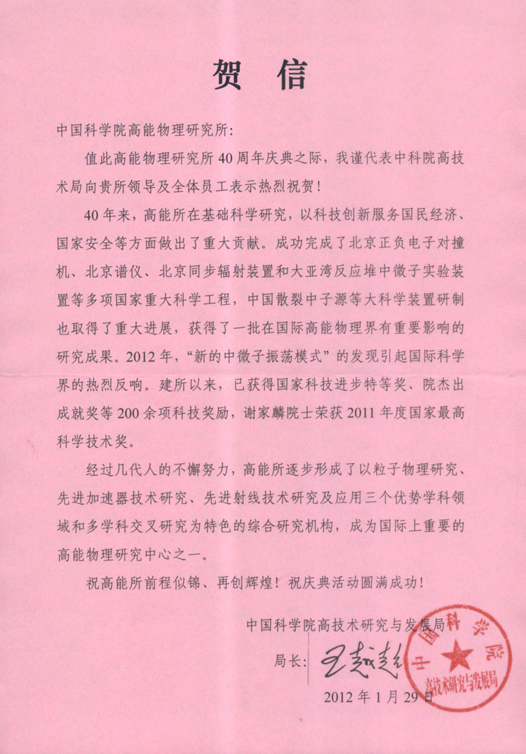 中国科学院高技术研究与发展局贺信