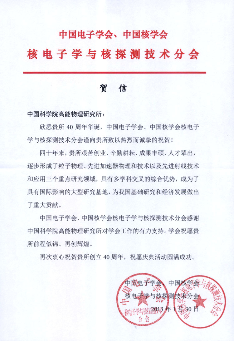 中国电子学会、中国核学会核电子学与核探测技术分会贺信