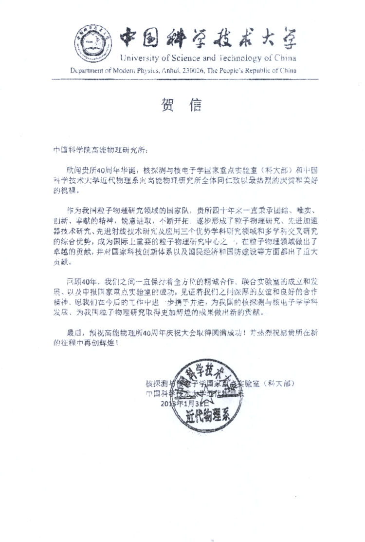 中国科学技术大学近代物理系贺信