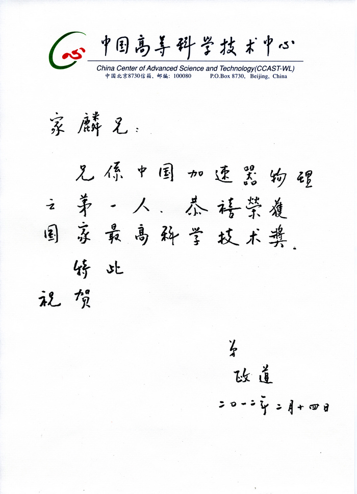 诺贝尔奖获得者李政道教授贺信