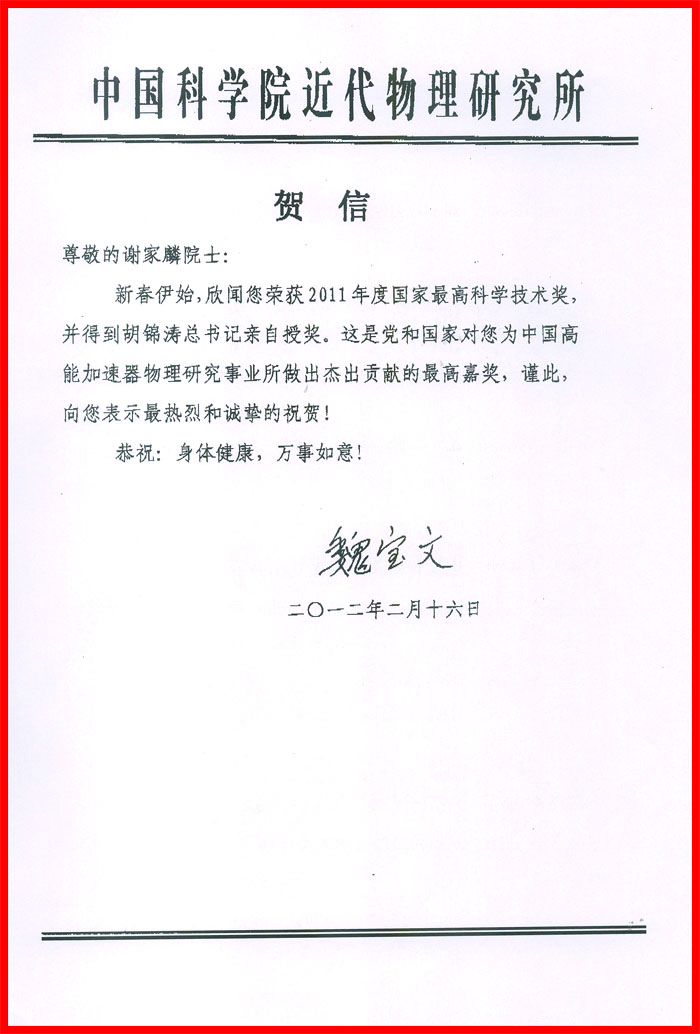 中国科学院近代物理研究所魏宝文贺信