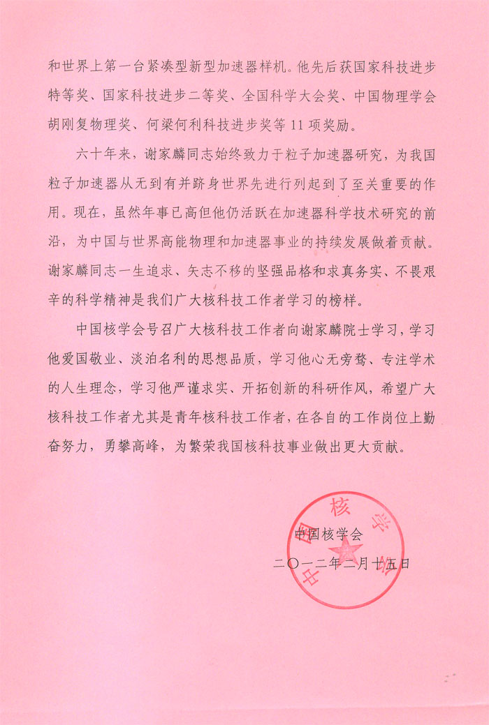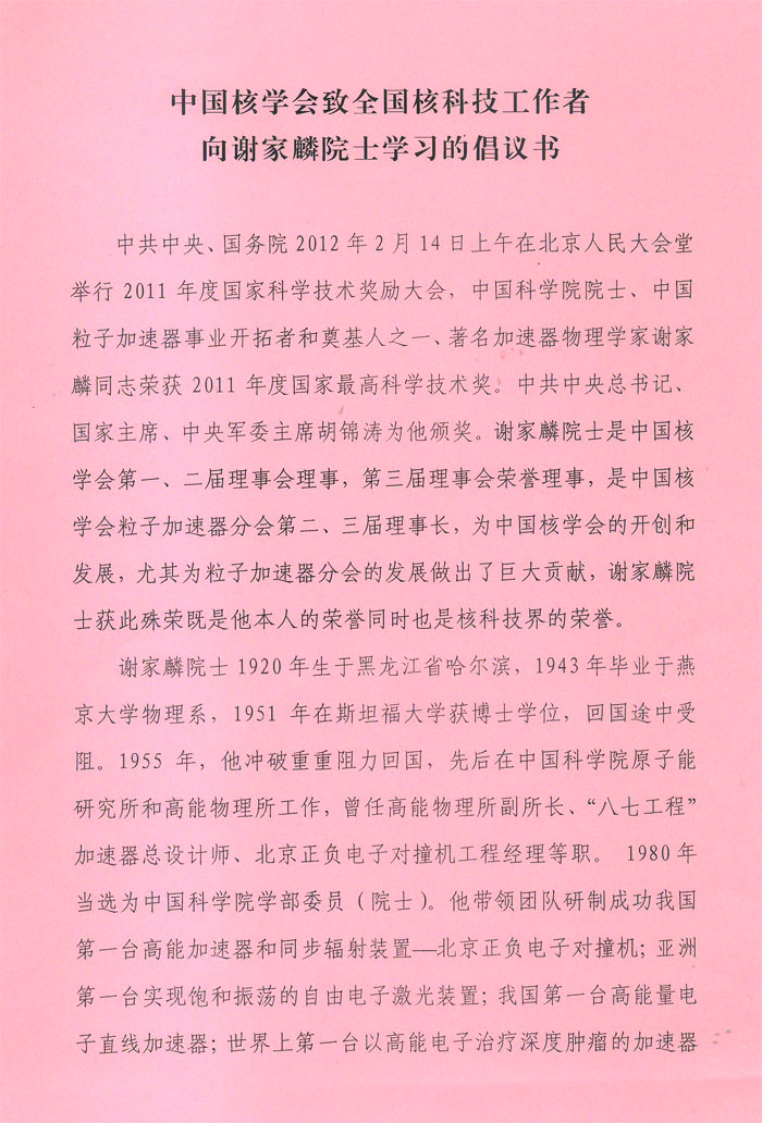 中国核学会致全国核科技工作者向谢家麟院士学习的倡议书