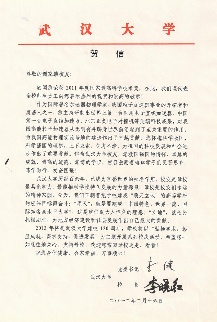 武汉大学贺信党委书记李健、校长李晓红贺信