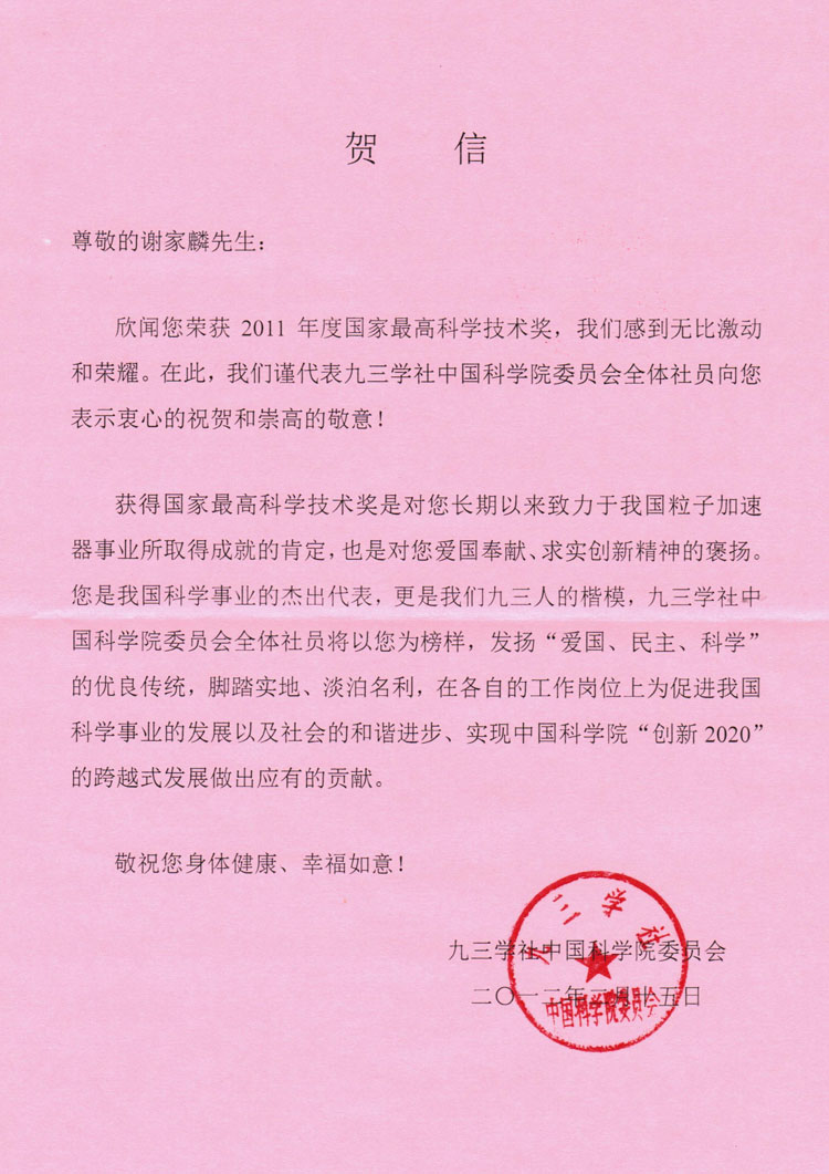 九三学社中国科学院委员会贺信