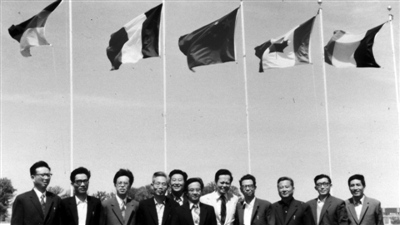 1978年,高能加速器设计考察组在FNAL升起中国国旗后合影留念,右四为谢家麟。