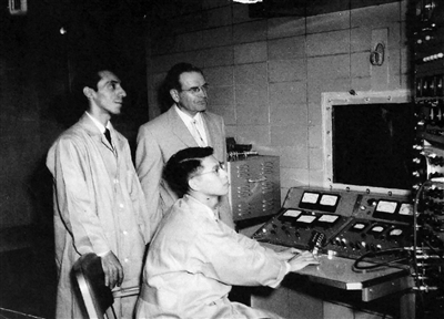 上世纪50年代,谢家麟在45MeV医用电子直线加速器控制台上工作。