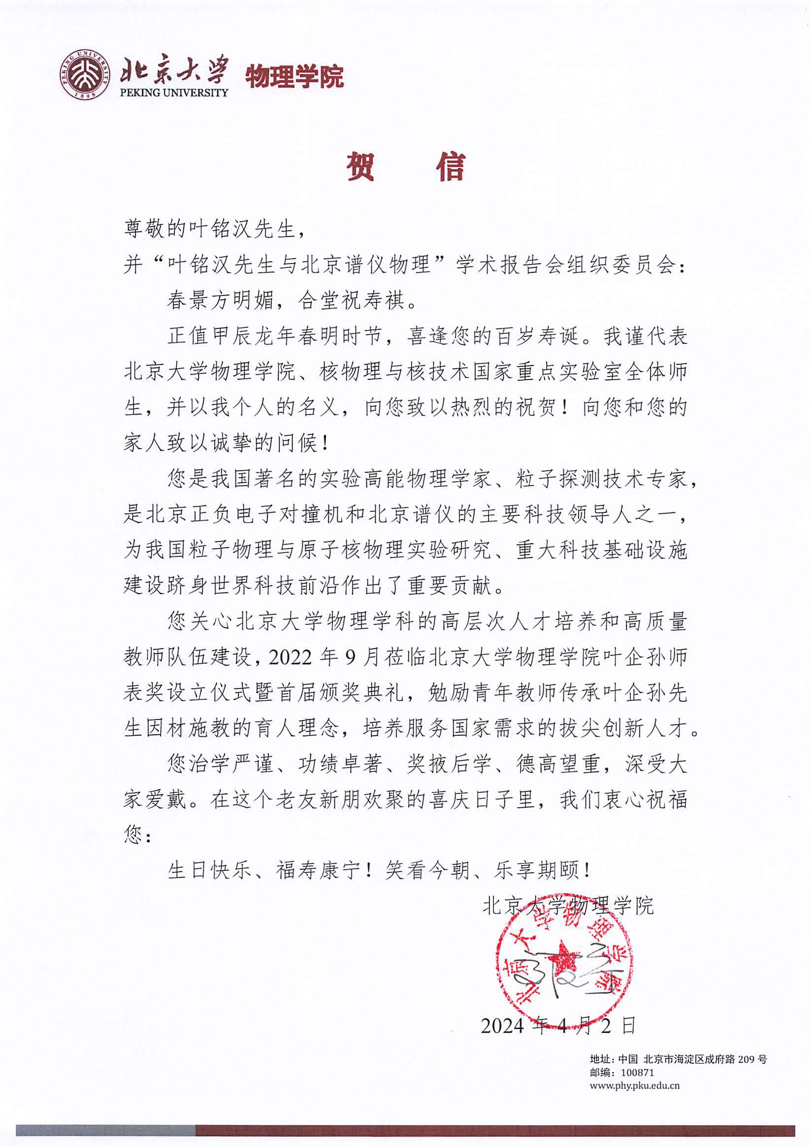 北京大学物理学院贺信