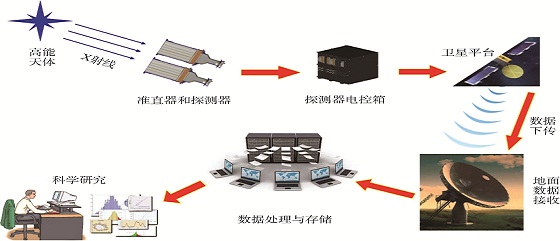 HXMT 探测器探测到天体的X射线辐射信号之后,探测信号转换成科学数据并经卫星平台下传,地面卫星数据接收站接受到数据之后将送至数据中心进行处理并保存,科学家利用经过前期处理的观测数据即可开展科学研究。