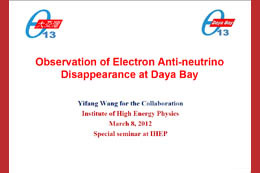 北京时间2012年3月8日14时,大亚湾中微子实验国际合作组发言人王贻芳在北京宣布,大亚湾中微子实验发现了一种新的中微子振荡,并测量到其振荡几率。介绍该结果的论文已于3月7日送交美国物理评论快报(Physical Review Letters)发表,其预印本也已在网上发表。3月8日16时,王贻芳在快盈v3做学术报告,并通过网络直播,向全世界的粒子物理学家报告他们的结果。