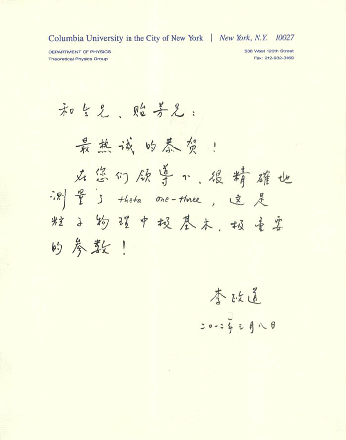 Prof. Lee sends his warmest congratulations on your tremendous success in the accurate determination of theta one-three.