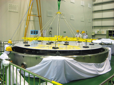 这是在没有灌装闪烁液之前的圆柱形反中微子探测器内部照片。该探测器用于捕捉反中微子产生的微弱闪光。高灵敏的光电倍增管排列在探测器的壁上。