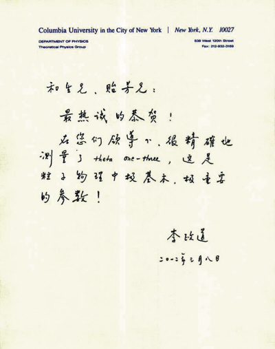 诺贝尔物理学奖得主李政道给大亚湾中微子实验组负责人发来的贺信。